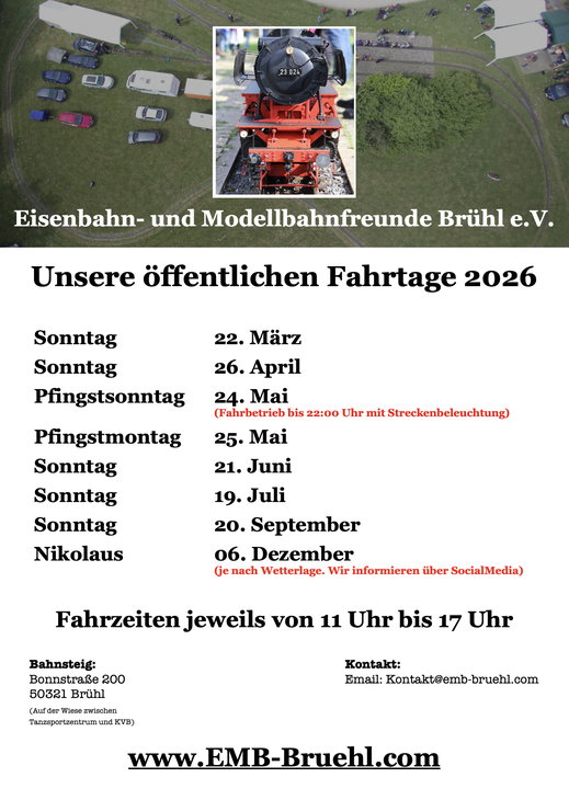 Nach längeren und intensiven Gesprächen im Verein sind wir überein gekommen in diesem Jahr keinen öffentlichen Fahrtag auf unserem Außengelände in Brühl-Süd zu veranstalten. Diese Entscheidung ist uns nicht leicht gefallen. Es ist aber unter den jetzt absehbaren Bedingungen nicht möglich einen, den Vorschriften konformen, Ablauf zu gewährleisten. Sollte sich im späten September doch noch eine Gelegenheit bieten, werden wir auf unserer Homepage, Facebook und Instagram die „Werbetrommel“ rühren und einen Termin bekannt geben.